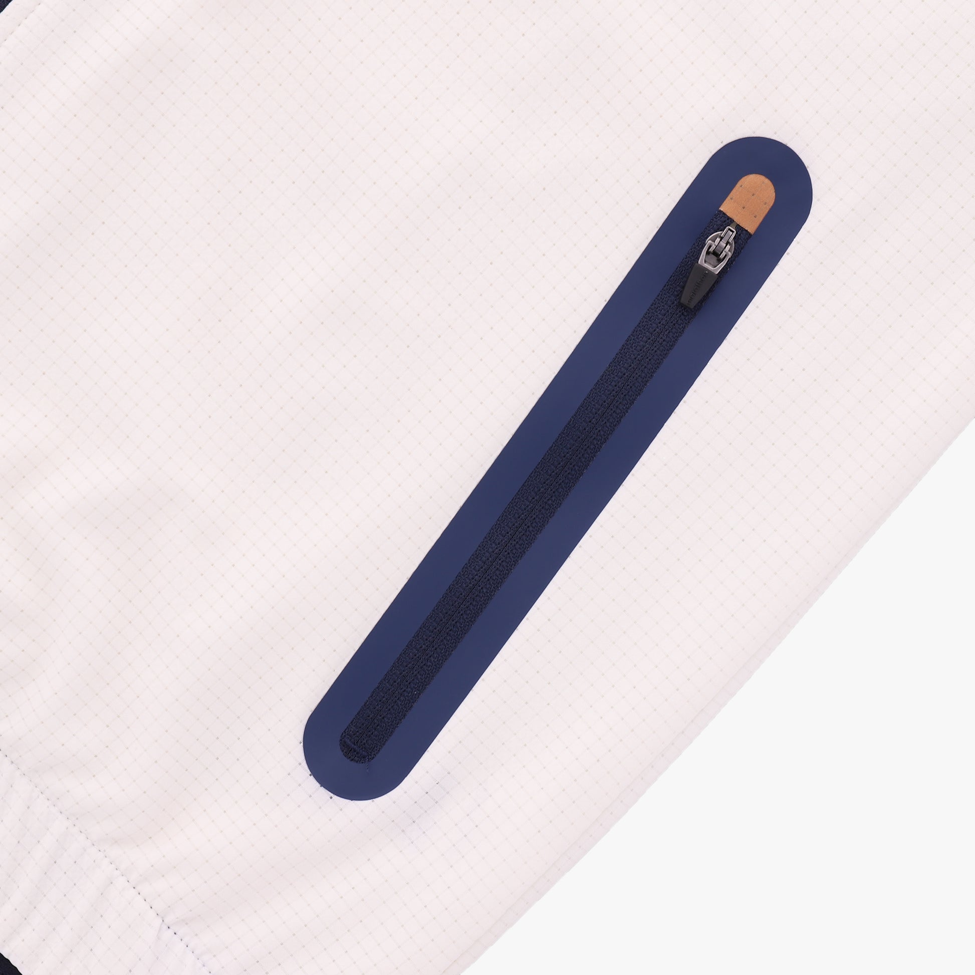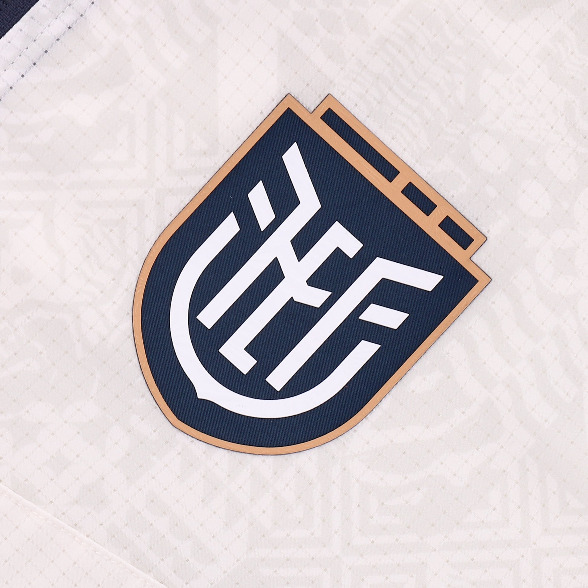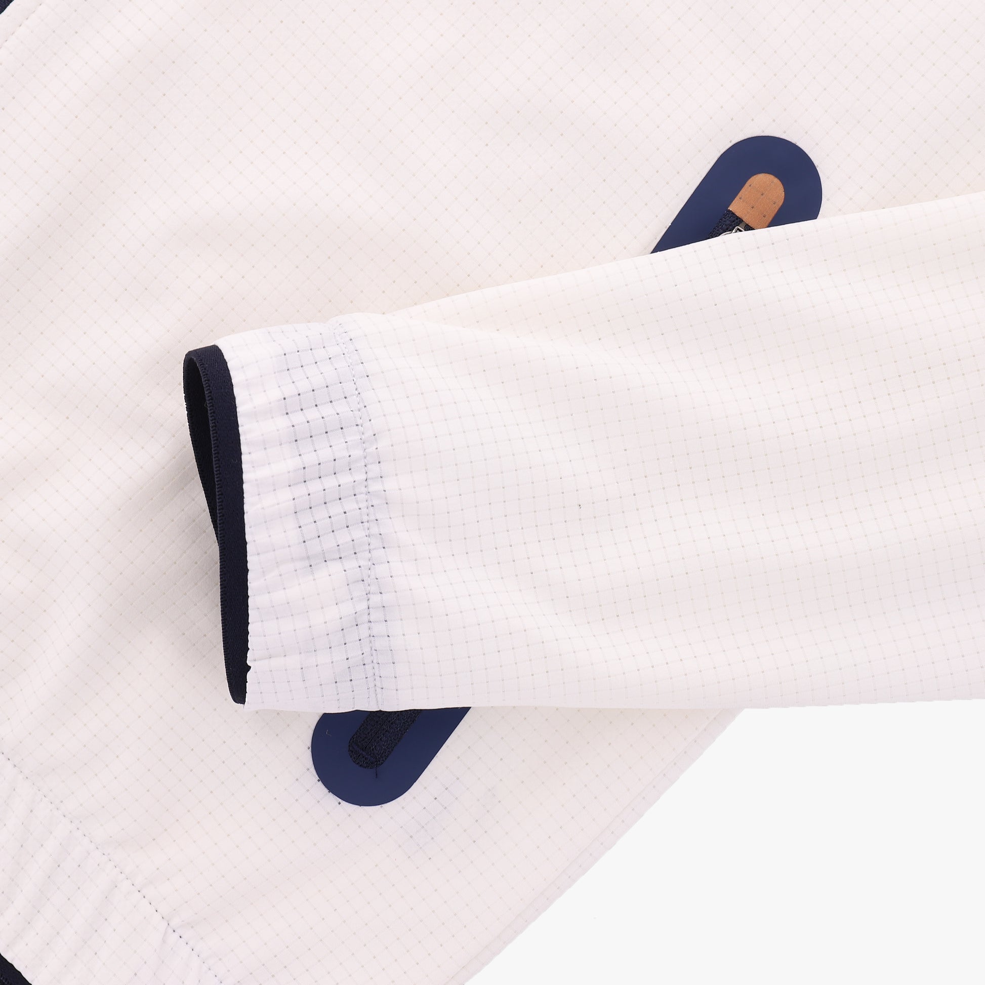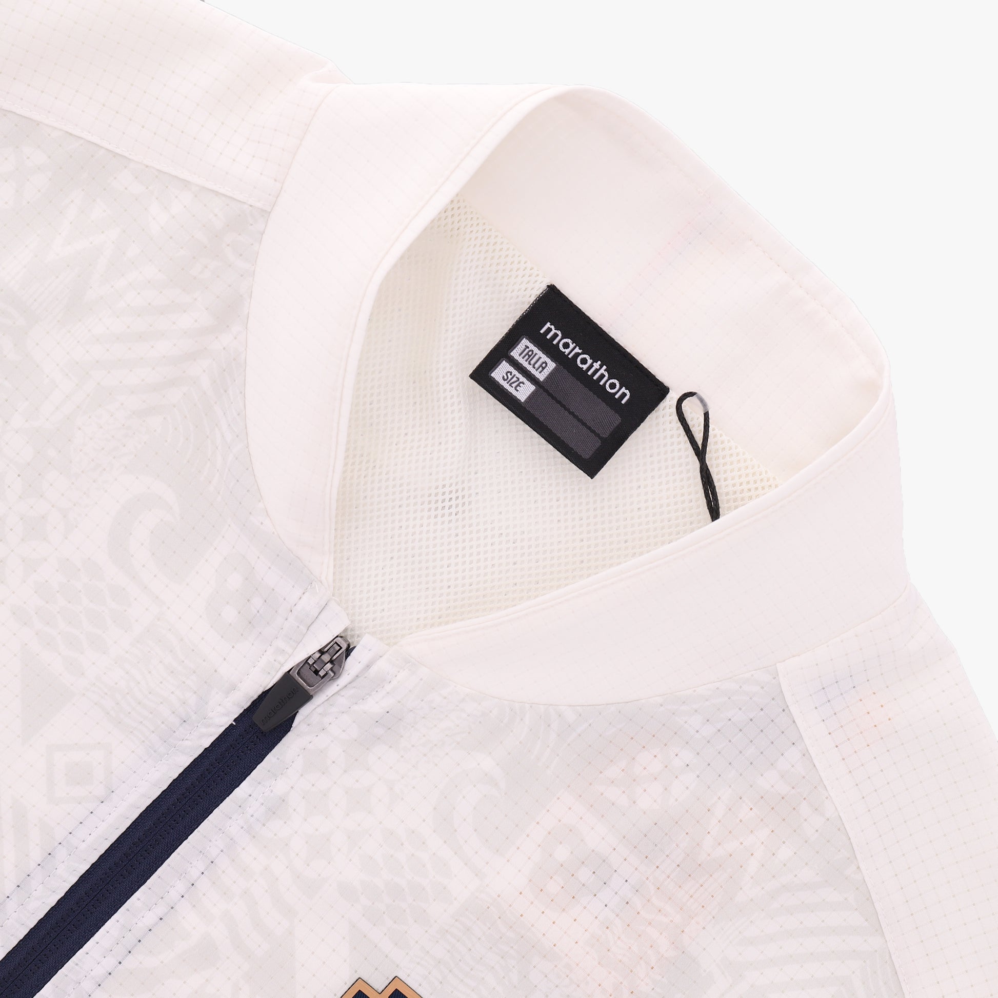 • Minimalist Tournament Aesthetic: Clean white base featuring a subtle tonal graphic across the shoulders and a navy blue stand-up collar for a refined finish.