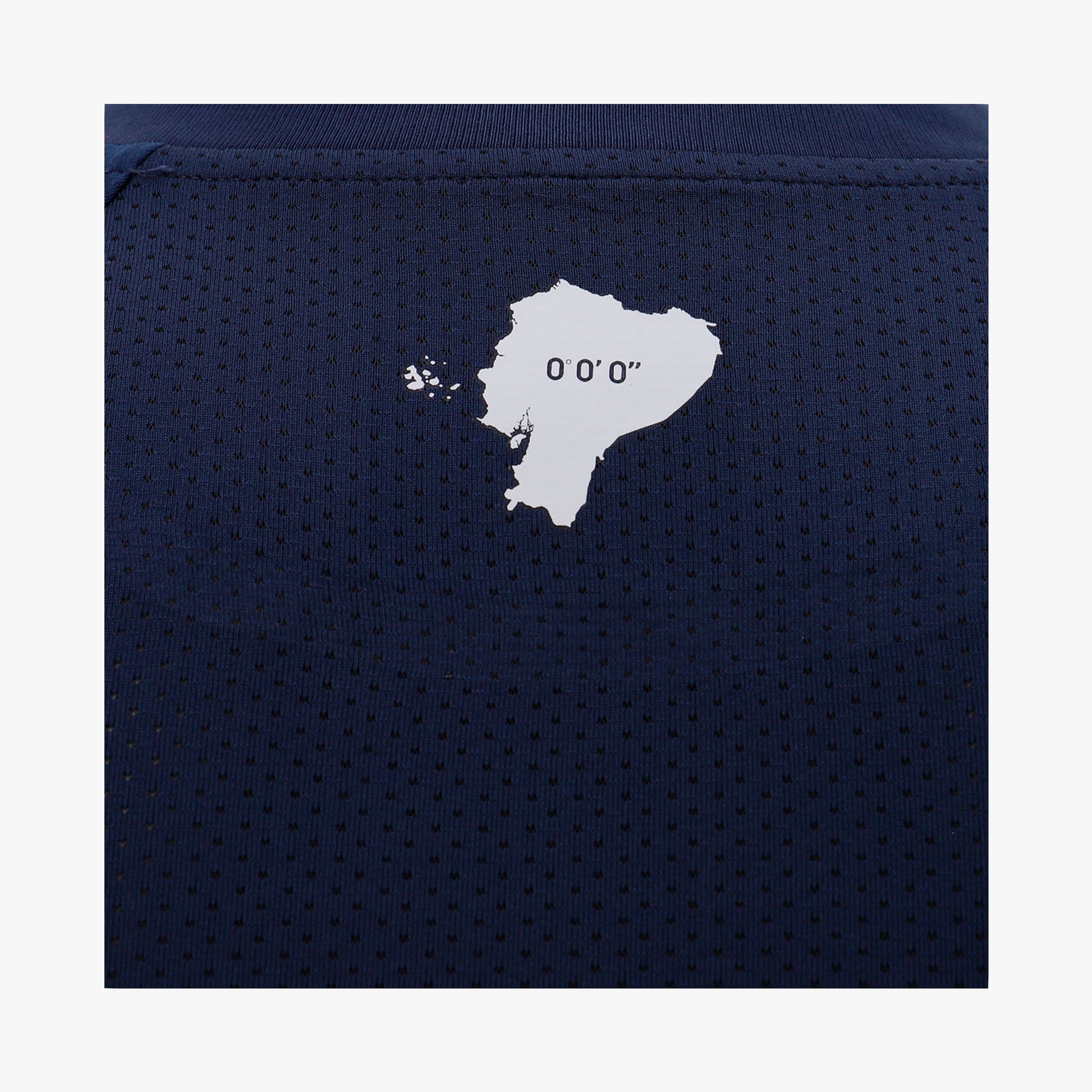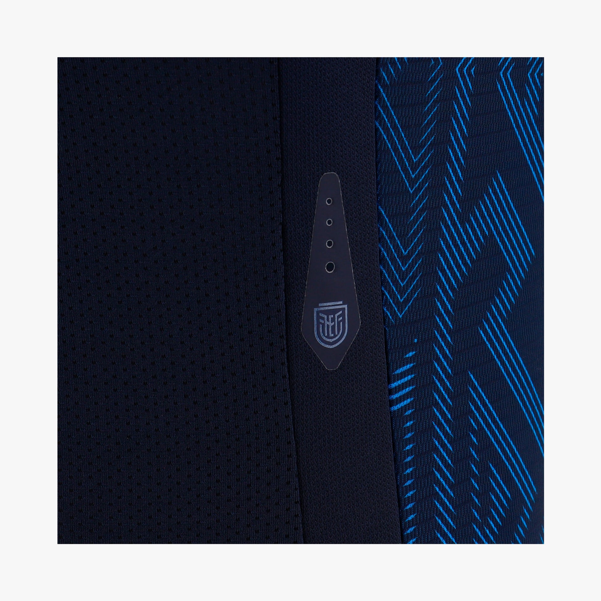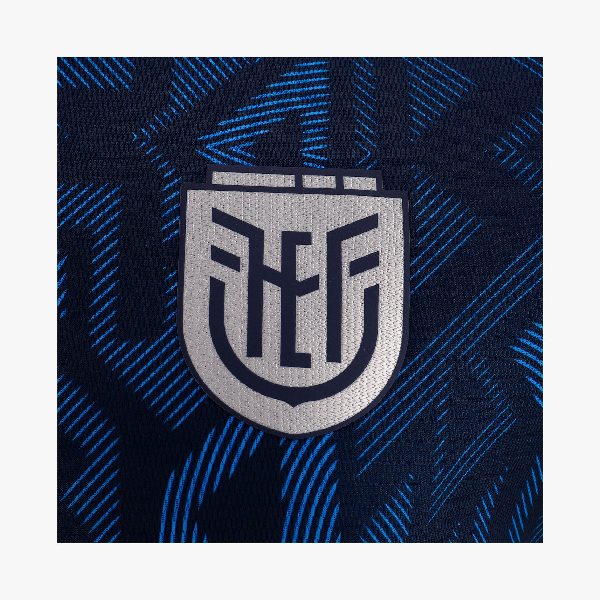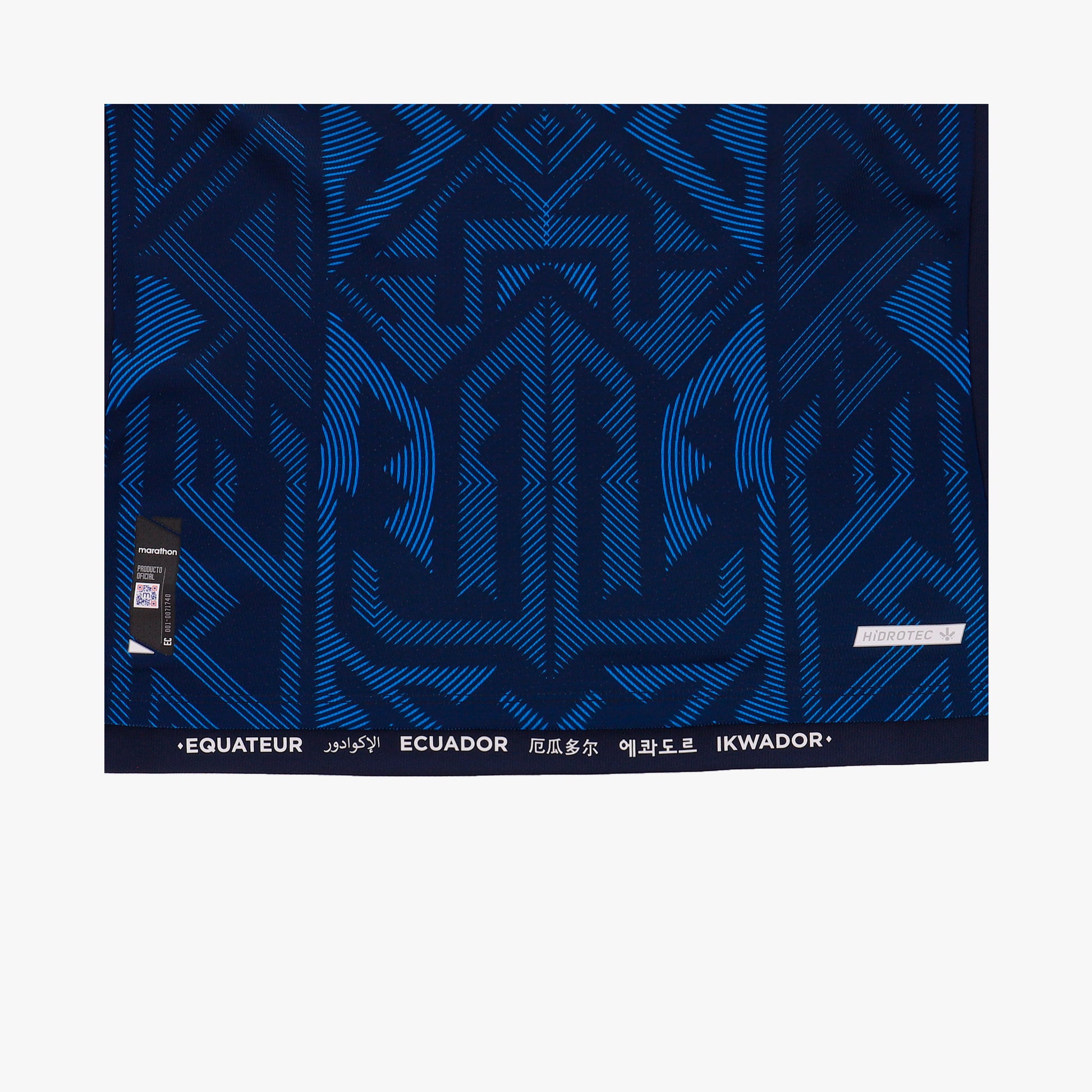 The Ecuador National Team's FEF QATAR 2022 away jersey has soul, spirit and devotion to the tricolor. Designed in blue and navy blue, the front features unique patterns and symbols that unite us as a country. It has elegant white details on the collar and sleeves, as well as details of our tricolor flag.
